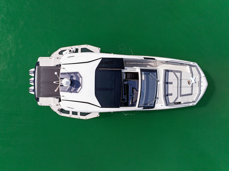 Aerial view of a Beneteau Flyer 12 yacht cruising at speed with its sliding sunroof open, showing the helmsman at the wheel, a teak swim platform, and a distinctive wood-accented hull cutting through the waves.