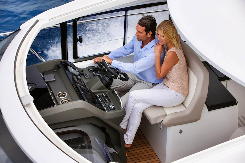 Couple seated together at the helm of a Jeanneau Leader 46 yacht, cruising with the sliding sunroof open, showing the modern dashboard and teak flooring beneath their feet.